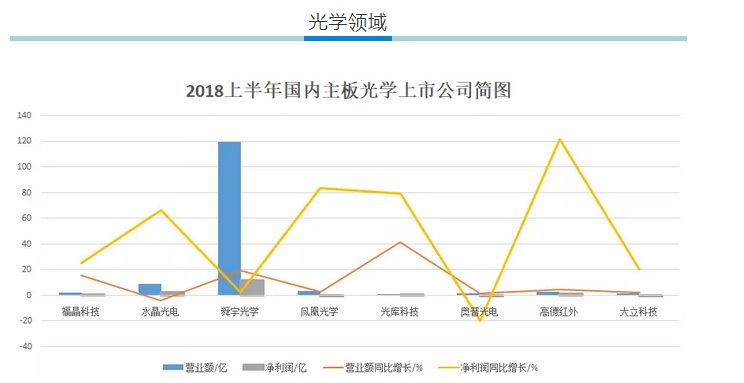 從上圖可以看出,2018年上半年,舜宇光學以119.76億元的營收和11.9億元的凈利潤遠超其他7家光學公司。智能手機3D感測市場對手機鏡頭模組的高端需求、自動駕駛對車載鏡頭的需求、智能制造對工廠機器視覺智能化鏡頭的需求,以及無人機、AR/VR新興領域對鏡頭的需求,使得一直專注在攝像頭領域、能夠提供全套先進解決方案的舜宇光學科技成為最大的受益者。這些熱門的、新興的市場成為舜宇光學生長的沃土,給予了無限發(fā)展的可能。