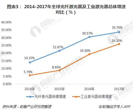 對比工業(yè)激光器行業(yè)總體,近年來全球光纖激光器的行業(yè)增速總體和工業(yè)激光器保持了較為一致的增長趨勢,但增速明顯高于工業(yè)激光器,可以看出光纖激光器的發(fā)展態(tài)勢要優(yōu)于工業(yè)激光器行業(yè)總體。2016-2017年全球光纖激光器的市場增速均在30%以上。