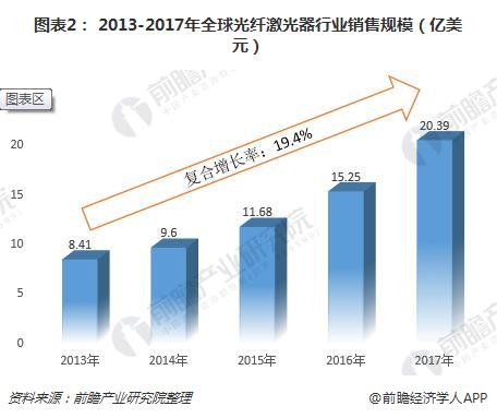 根據(jù)前瞻產(chǎn)業(yè)研究院發(fā)布的《2018-2023年中國激光產(chǎn)業(yè)市場前瞻與投資戰(zhàn)略規(guī)劃分析報告》,2017年全球光纖激光器的市場銷售規(guī)模突破20億美元,達(dá)到20.39億美元,2013-2017年的復(fù)合增長率接近20%。