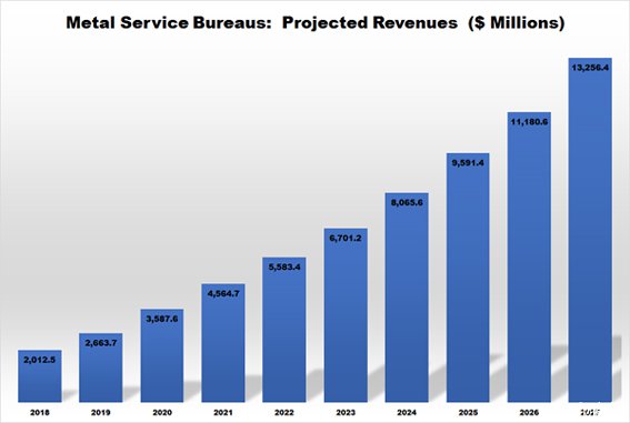 據(jù)預(yù)測,到2023年,金屬服務(wù)機構(gòu)將購買近5.5億美元的打印機,其中大部分將是PBF機器。此外,在2023年,增材制造服務(wù)機構(gòu)將消耗超過2.5億美元的金屬。