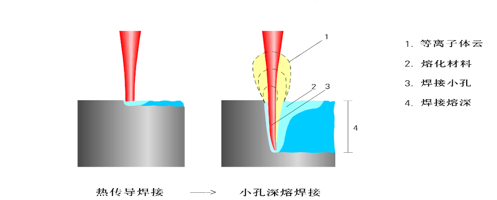 激光焊接采用連續(xù)或脈沖激光高能束加以實現(xiàn),分為熱傳導(dǎo)型焊接和激光深熔焊接。熱傳導(dǎo)型焊接:激光輻射加熱待加工表面,表面熱量通過熱傳導(dǎo)向內(nèi)部擴(kuò)散,通過控制激光功率、脈沖、能量密度等激光參數(shù),使工件熔化,形成特定的熔池。熔深淺,焊接速度慢。激光深熔焊接:在足夠高功率密度激光照射下,材料產(chǎn)生蒸發(fā)并形成小孔。這個充滿蒸氣的小孔猶如一個黑體,幾乎吸收全部的入射激光束能量,孔內(nèi)平衡溫度達(dá)25000℃左右,熱量從這個高溫孔腔外壁傳遞出來,使包圍著這個孔腔四周的金屬熔化。小孔和圍著孔壁的熔融金屬隨著前導(dǎo)光束前進(jìn)速度向前移動,熔融金屬充填著小孔移開后留下的空隙并隨之冷凝,于是焊縫形成。常見的均為激光深熔焊接。兩種焊接方式的比較如下圖: