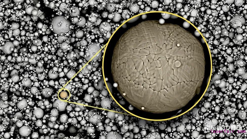 △用于3D打印的馬氏體鋼粉。插圖顯示了鋼粉的放大視圖。