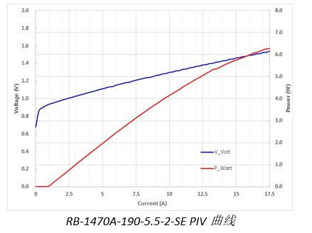本次發(fā)布的1470nm芯片型號為RB-1470A-190-5.5-2-SE,發(fā)光條寬190μm,工作電流15A,工作功率5.5W,光電轉(zhuǎn)換效率23%。