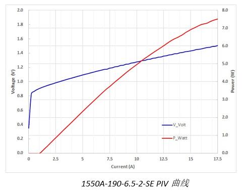 本次發(fā)布的1550nm芯片型號為RB-1550A-190-6.5-2-SE,發(fā)光條寬190μm,工作電流15A,工作功率6.5W,光電轉(zhuǎn)換效率29%。