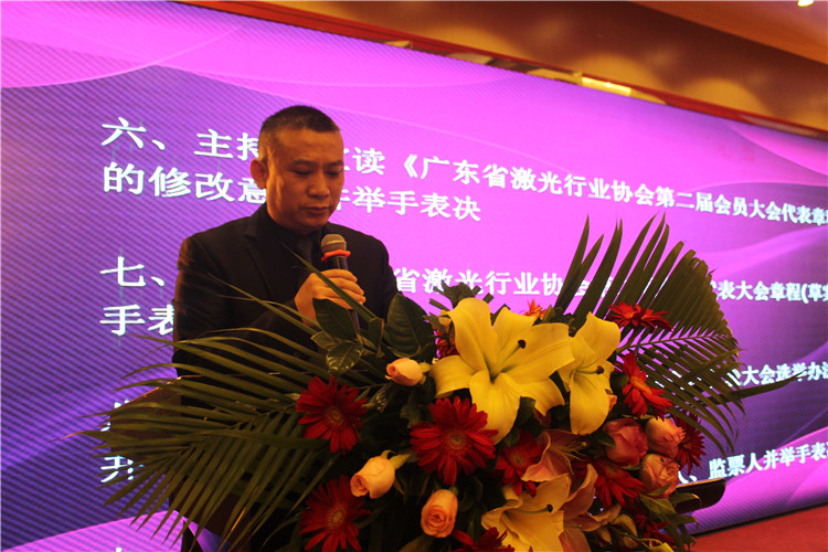 協(xié)會(huì)秘書處陳明新宣讀《廣東省激光行業(yè)協(xié)會(huì)第二屆會(huì)員大會(huì)代表章程(修改意見稿)》等多項(xiàng)制度,并主持現(xiàn)場(chǎng)表決