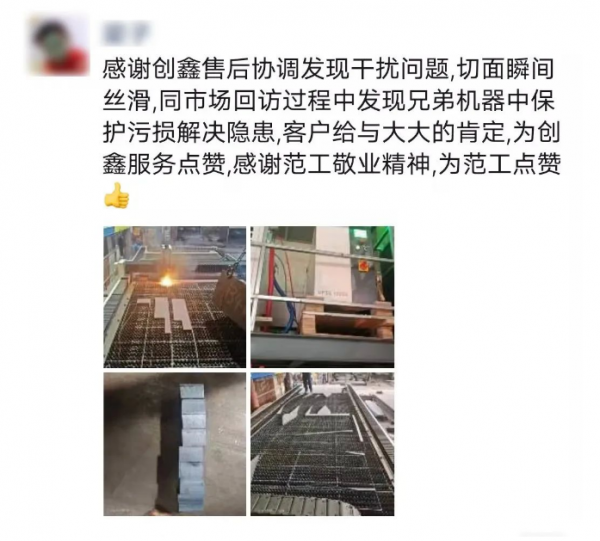 由于用戶平時也會用到空氣切割,雖然有不同材質(zhì),但調(diào)試方法相對較簡單,為了讓客戶盡量能夠?qū)W會自己調(diào)整,方便日常加工需求,張工現(xiàn)場對操作人員講解了切割原理,毛刺如何優(yōu)化等,教會客戶針對不同材質(zhì)厚度如何調(diào)整參數(shù)。處理完問題后張工依舊在跟進(jìn)用戶使用情況,用戶表示設(shè)備一直穩(wěn)定切割,并對張工的專業(yè)和敬業(yè)精神給予了高度認(rèn)可。