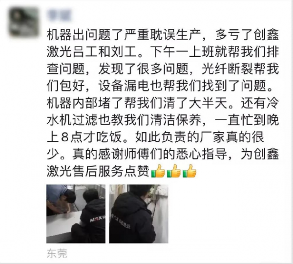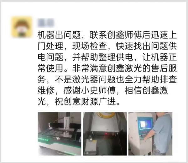除了在用戶提出服務(wù)需求提供幫助,創(chuàng)鑫激光“金保姆”售后服務(wù)團(tuán)隊還會不定時回訪終端用戶,幫助用戶勘察設(shè)備環(huán)境是否需要改進(jìn),配套設(shè)施及參數(shù)是否正常等,團(tuán)隊成員也在持續(xù)不斷的提升自身專業(yè)技能,力求用更專業(yè)的技術(shù)、更及時的服務(wù)以及更認(rèn)真的態(tài)度,為所有客戶及用戶提供最優(yōu)質(zhì)的服務(wù)!
