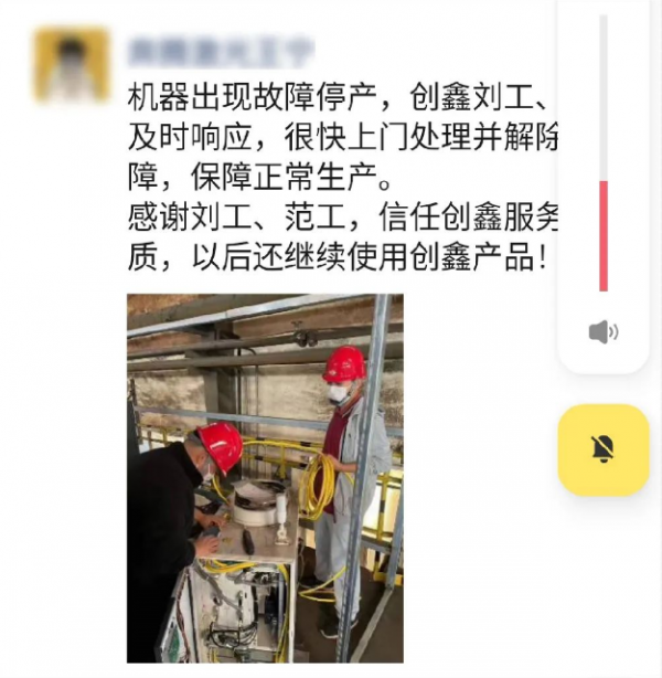 眾所周知,對于工業(yè)設(shè)備用戶來說,時間就是效益(金錢)。設(shè)備一旦出現(xiàn)故障,如果售后服務(wù)不及時就會要停工,甚至造成訂單無法按時交付。所以終端用戶不僅需要品質(zhì)性能穩(wěn)定的產(chǎn)品,更需要高效周到的售后服務(wù)隨時為他們排憂解難。創(chuàng)鑫激光始終把用戶服務(wù)放在首位,為此組建了一支專業(yè)技術(shù)過硬、具有豐富經(jīng)驗的“金保姆”服務(wù)團(tuán)隊,為客戶和用戶提供完善的售前、售后和在線服務(wù)。