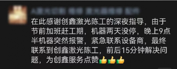 更多客戶好評無法一一展現(xiàn),在此感謝所有創(chuàng)鑫客戶對創(chuàng)鑫產(chǎn)品和服務(wù)的認(rèn)可。