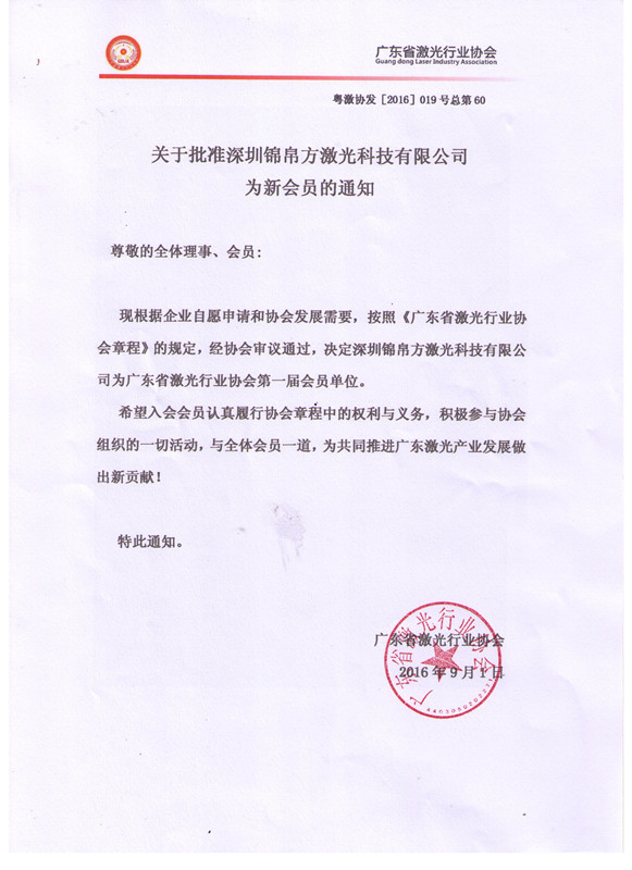 關(guān)于批準(zhǔn)深圳錦帛方激光科技有限公司為新會員的通知