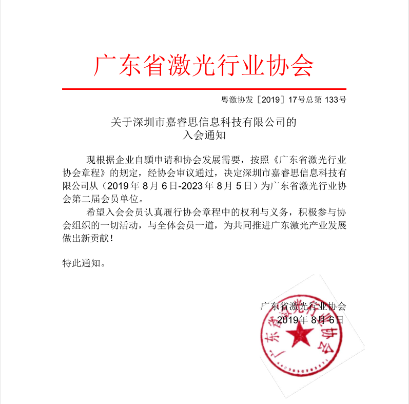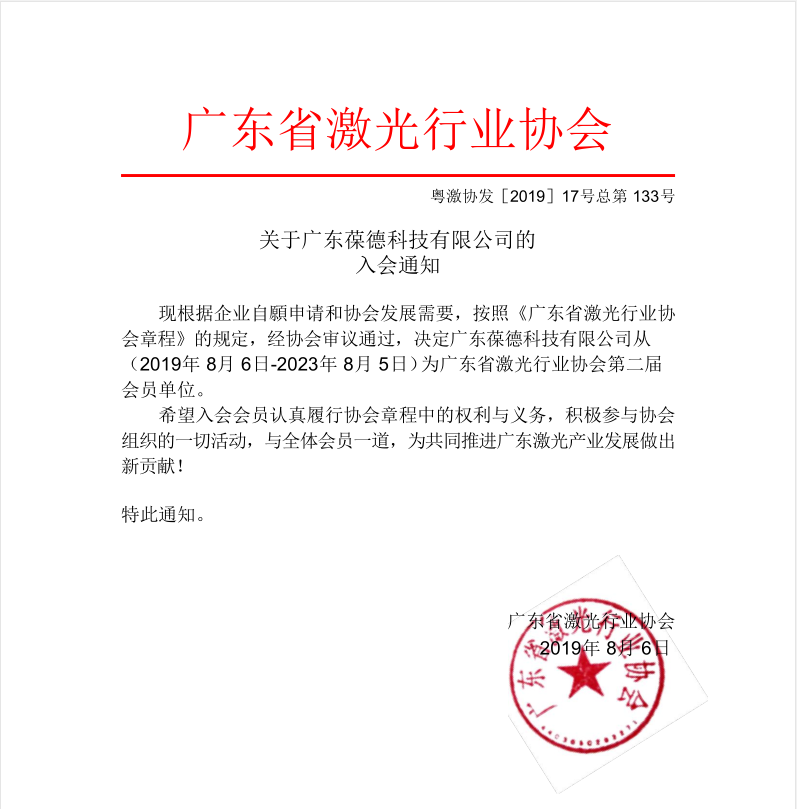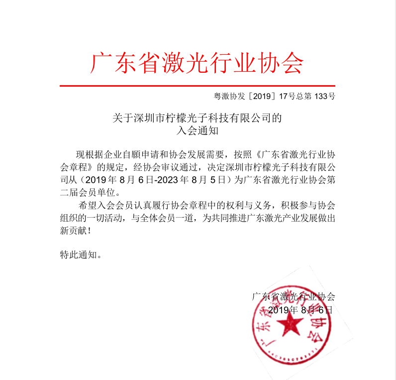 根據(jù)企業(yè)自願申請和協(xié)會發(fā)展需要,按照《廣東省激光行業(yè)協(xié)會章程》的規(guī)定,經(jīng)協(xié)會審議通過,決定深圳市東露陽實業(yè)有限公司從(2019年8月1日-2023年7月31日)為廣東省激光行業(yè)協(xié)會第二屆會員單位。
