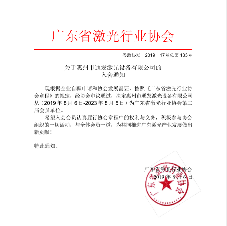 關(guān)于惠州市通發(fā)激光設(shè)備有限公司入會通知