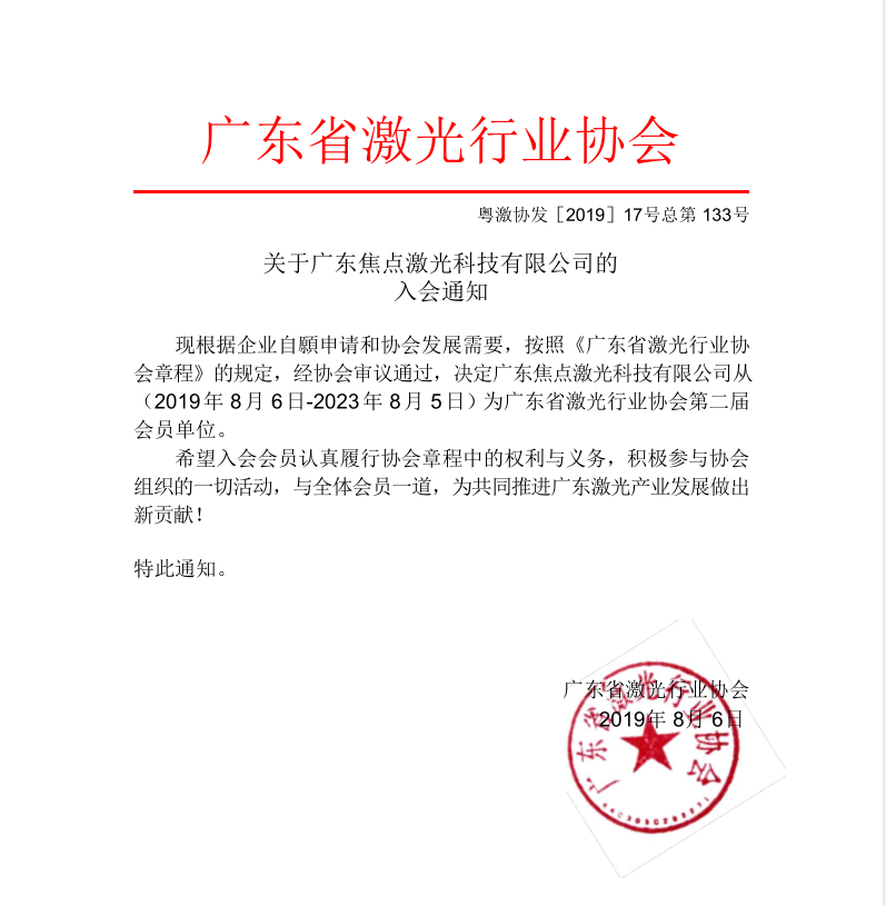 關(guān)于廣東焦點激光科技有限公司入會通知