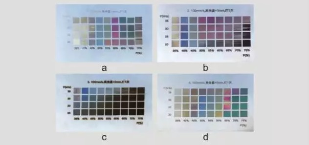 圖3中,離焦量分別取+4mm、+3mm、+2mm、+5mm。打標(biāo)色盤中,橫坐標(biāo)為激光功率,由35%至75%等間隔遞增,縱坐標(biāo)為激光頻率,由20kHz至35kHz等間隔遞增。觀察角度為60°(與工件表面呈60°觀察)。圖3(c)中,離焦量為+2mm時,可見大部分的打標(biāo)方塊內(nèi)的不銹鋼表面被灼燒至焦黃偏黑,此時材質(zhì)表面離焦點(diǎn)較近,激光能量密度偏大,打標(biāo)色盤中的顏色不夠豐富。由(a)、(b)、(d)可以看出,在20~35kHz的頻率范圍內(nèi),當(dāng)激光功率不變時,隨激光頻率變化,打標(biāo)顏色幾乎不變。打標(biāo)顏色主要隨激光功率的變化而改變。當(dāng)離焦量為+3mm時,在某一頻率下,隨激光功率增大,打標(biāo)顏色變化規(guī)律為:淡黃→藍(lán)色→淡綠→粉紅→紫紅→深紫→黃黑;當(dāng)離焦量為+4mm時,隨激光功率增大,打標(biāo)顏色變化規(guī)律為:淡黃→金黃→深藍(lán)→黃綠→紫紅→墨綠;當(dāng)離焦量為+5mm時,隨激光功率增大,打標(biāo)顏色變化規(guī)律為:淡黃→金黃→淡藍(lán)→黃綠→紫紅→墨綠。這些規(guī)律與前述理論推導(dǎo)的規(guī)律大體相符。
