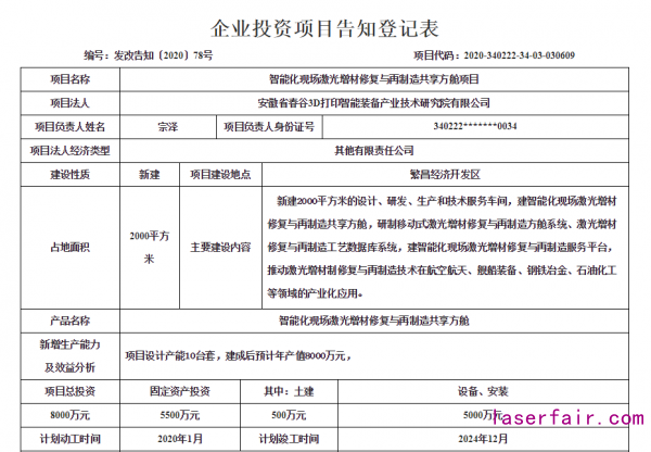 據(jù)安徽省蕪湖市繁昌縣發(fā)改委公示的《企業(yè)投資項目告知登記表》顯示,國內(nèi)首個智能化現(xiàn)場激光增材修復(fù)與再制造共享方艙項目由安徽省春谷3D打印智能裝備產(chǎn)業(yè)技術(shù)研究院有限公司負責籌建。該項目建設(shè)地點位于繁昌經(jīng)濟開發(fā)區(qū),占地面積2000平方米,項目總投資8000萬元。