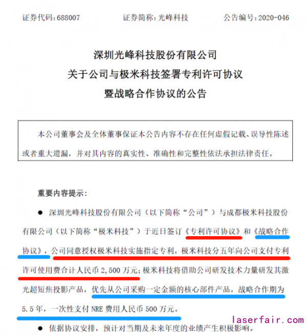 9月2日,深圳光峰科技股份有限公司(688007.SH,以下簡(jiǎn)稱“光峰科技”)發(fā)布公告稱,已與成都極米科技股份有限公司(以下簡(jiǎn)稱“極米科技”)簽署《戰(zhàn)略合作協(xié)議》,極米科技將在未來(lái)5年半戰(zhàn)略合作期內(nèi)借助光峰科技的研發(fā)技術(shù)力量研發(fā)其激光超短焦投影產(chǎn)品,并優(yōu)先向光峰科技采購(gòu)一定金額的核心部件產(chǎn)品。另極米科技一次性支付NRE費(fèi)用(Non-Recurring Engineering,一次性工程費(fèi)用)500萬(wàn)元。