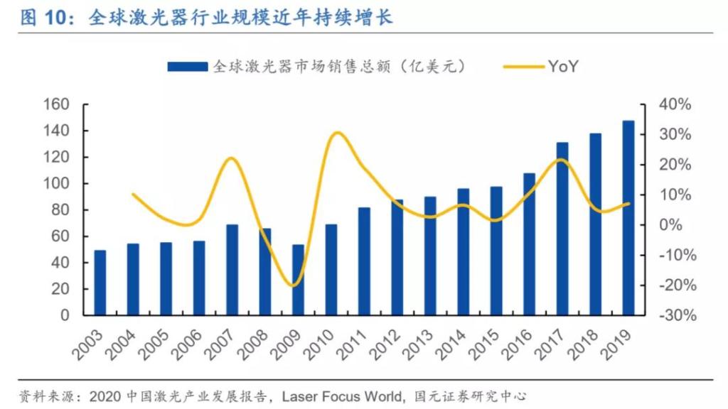近年全球激光器市場銷售規(guī)模增速持續(xù)回升,疫情拖累 2020 年表現(xiàn)。據(jù)中國科學(xué)院武漢文獻情報中心、中國激光雜志社、中國光學(xué)學(xué)會統(tǒng)計,2019 年全球激光器銷售額147.3億美元,同比增長7.1%,自 2018 年中美貿(mào)易戰(zhàn)開始,激光產(chǎn)品進出口受到一定沖擊,2018年激光產(chǎn)業(yè)規(guī)模增速大跌至5.27%,伴隨貿(mào)易戰(zhàn)緩解,產(chǎn)業(yè)規(guī)模增速呈回升趨勢,2019 年增速同比提升 2.88 個百分點。2020 年受全球經(jīng)濟增 速放緩及新冠疫情影響,預(yù)計 2020 年全球激光器產(chǎn)業(yè)規(guī)模將有所收縮。
