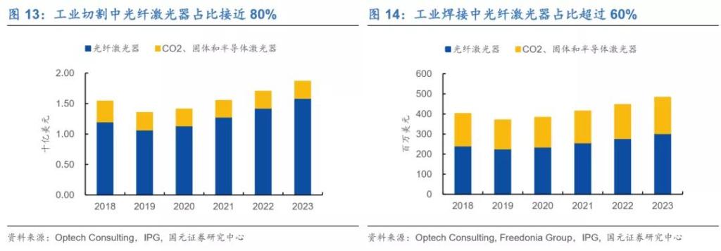 工業(yè)激光中光纖激光器已為主流,占比持續(xù)上升。由于光纖激光器具有使用成本較低、精密加工能力強、停機修整時間短等優(yōu)勢,在激光器的工業(yè)應(yīng)用中光纖激光器占比逐步提升,已經(jīng)成為工業(yè)應(yīng)用首選激光器,據(jù)Optech Consulting統(tǒng)計,2019年全球金屬切割激光設(shè)備中使用光纖激光器占比78.74%,規(guī)模10.7億美元,全球焊接與釬焊激光設(shè)備中光纖激光器占比61.08%,規(guī)模 2.26 億美元。