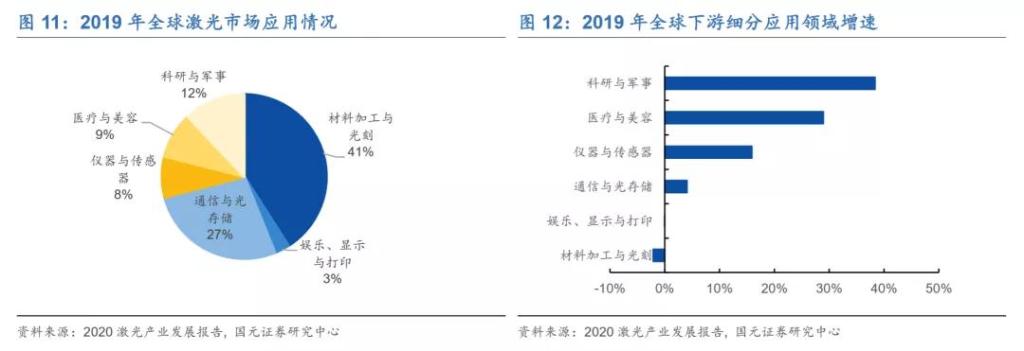 工業(yè)加工為全球激光器主要下游應(yīng)用市場,非工業(yè)應(yīng)用增速較快。2019 年材料加 工與光刻市場規(guī)模為 60.3 億美元,依舊為全球激光器應(yīng)用市場最大細分領(lǐng)域,通信與光儲存以 39.8 億美元的規(guī)模位居第二??蒲信c軍事市場和醫(yī)療與美容市場份額上 升速度較快,同比分別增長 38%和 29%。