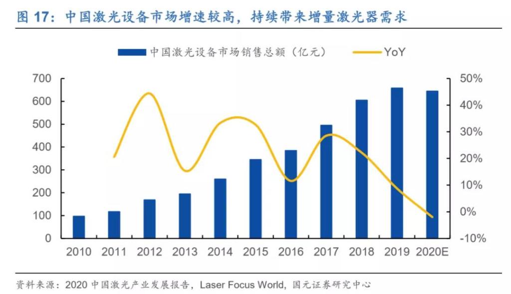 中國為全球最大激光設(shè)備市場,帶來巨量激光器需求。中國激光產(chǎn)業(yè)整體起步較晚,但伴隨中國裝備制造業(yè)快速發(fā)展,占據(jù)了全球約一半工業(yè)激光器應(yīng)用市場,涌現(xiàn)了大量激光設(shè)備集成商,2019 年中國激光設(shè)備銷售收入 658 億元,同比增長 8.76%, 相比 2017 和 2018 年的爆發(fā)式增長增速有所放緩但仍保持增長趨勢。2020 年受到新冠疫情全球經(jīng)濟不穩(wěn)定性影響,預(yù)計 2020 年激光設(shè)備銷售規(guī)模 645 億元,首次同比下滑 1.98%。激光設(shè)備市場的擴張為激光器帶來大量需求,從而推動了中國激光器產(chǎn)業(yè)的發(fā)展。