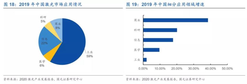 工業(yè)領(lǐng)域應(yīng)用仍為主流,非工業(yè)領(lǐng)域快速追趕。2019 年中國工業(yè)領(lǐng)域激光設(shè)備銷售收入386.6 億元,為占比最高的應(yīng)用領(lǐng)域,占比接近 60%,但 2019 年工業(yè)領(lǐng)域增速僅1.95%。商業(yè)領(lǐng)域銷售收入新增15.2億元,同比增長 38.38%,為增速最快的應(yīng)用領(lǐng)域。