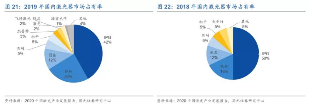 國內(nèi)光纖激光器市場競爭激烈,IPG 等海外龍頭占比下降。2019 年國內(nèi)光纖激光器制造商銳科激光、杰普特、創(chuàng)鑫激光市占率為39%,相比 2018 年同比提升 4 個 百分點。行業(yè)龍頭 IPG 在中國區(qū)市占率大幅下跌 8 個百分點,主要由于銳科、創(chuàng)鑫等公司在 6KW 以上高功率光纖激光器競爭力逐漸增強,國產(chǎn)化替代趨勢明顯。