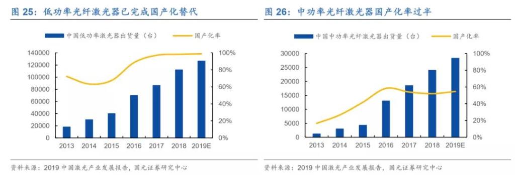 中低功率光纖激光器國產(chǎn)技術(shù)逐漸成熟,國產(chǎn)化率趨于平穩(wěn)。經(jīng)過多年發(fā)展,國產(chǎn)低功率光纖激光器技術(shù)成熟成本較低,國內(nèi)市場已基本完成國產(chǎn)化替代,國產(chǎn)低功 率光纖激光器出貨量從 2013 年的 1.3 萬臺上升至 2018 年的 11 萬臺,國產(chǎn)化率 98.2%。國產(chǎn)中功率光纖激光器自 2014 年問世后由于其價格優(yōu)勢快速搶占市場, 2018 年國產(chǎn)化率達到 52.1%,伴隨著相關(guān)技術(shù)逐漸成熟同時關(guān)鍵激光元器件可以從國內(nèi)采購或自產(chǎn),中功率光纖激光器國產(chǎn)化占比將繼續(xù)提升。