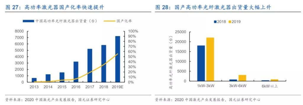 高功率光纖激光器將成為市場爭奪主戰(zhàn)場,國產(chǎn)化進展迅猛。伴隨著國內(nèi)光纖激光器制造商技術(shù)實力提升,國產(chǎn)高功率光纖激光器能效顯著提升,在高功率光纖激光 器市場開始參與競爭。2019 年國產(chǎn)光纖激光器出貨量大幅上升,6kW 以上高功率 光纖激光器出貨 800 臺,超過 2018 年出貨量兩倍,同時 3kW 以上激光器出貨量也 大幅提升至 3000 臺,超過 2018 年出貨量四倍,近年國產(chǎn)化率保持大幅提升趨勢,高端光纖激光器將成為國內(nèi)外廠商競爭主戰(zhàn)場。