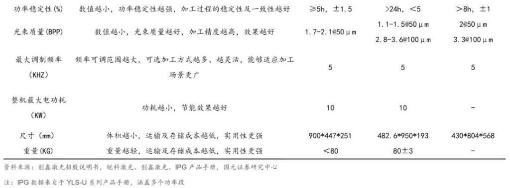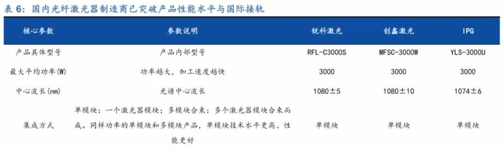行業(yè)龍頭技術(shù)持續(xù)突破,技術(shù)水平與國際接軌。高功率光纖激光器技術(shù)門檻較高,國外光纖激光器制造商一直在高功率領(lǐng)域占有優(yōu)勢,國產(chǎn)激光器龍頭銳科激光自主 研制出第一臺 1kW、4kW、10kW 連續(xù)光纖激光器填補了國內(nèi)高功率光纖激光器領(lǐng)域的空白,率先實現(xiàn)了工業(yè)光纖激光器產(chǎn)業(yè)化,推動光纖激光器技術(shù)水平逐漸與國際接軌。從產(chǎn)品各項性能指標來看,在國產(chǎn)光纖激光器已經(jīng)形成突破的功率段,與 國際激光器巨頭 IPG 產(chǎn)品性能較為接近。