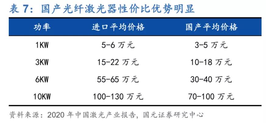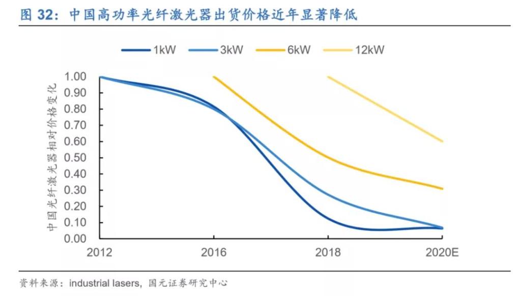 高功率光纖激光器占激光設(shè)備成本超40%,降價趨勢將顯著降低激光設(shè)備采購成本。在光纖激光器的激烈競爭之下,近年光纖激光器成本大幅下降,由于國內(nèi)企業(yè)從低功率光纖激光器開始加入市場競爭,中低功率光纖激光器價格已顯著下降但高功率光纖激光器受到影響較小,目前伴隨著國內(nèi)企業(yè)開始參與高功率光纖激光器市場競爭,3kW 以上高功率光纖激光器價格有望出現(xiàn)顯著下降。