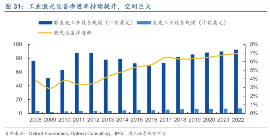 全球工業(yè)激光設(shè)備滲透率持續(xù)提升,但整體仍處于低位,潛在空間巨大。在切割、焊接、鉆孔、包層、打標等領(lǐng)域應(yīng)用的工業(yè)激光設(shè)備自 2009 年以來滲透率逐漸上 升。滲透率自 2009 年的 2.90%上升到了 2019 年的 6.36%,十年間工業(yè)激光設(shè)備 規(guī)??焖僭鲩L至接近 2009 年的四倍,且滲透率預(yù)計繼續(xù)保持上升態(tài)勢。目前工業(yè)激光設(shè)備滲透率仍有較大提升空間,滲透率每提升一個百分點就將為全球激光設(shè)備 帶來約九億美元市場。