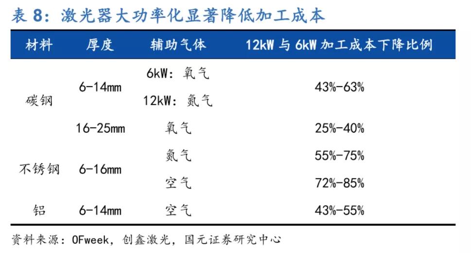 高功率激光器顯著降低加工成本,經(jīng)濟效益優(yōu)異。根據(jù)創(chuàng)鑫激光資料,激光切 割加工中將功率從 6kW 多模激光器提升至 12kW 多模激光器,帶來加工成本 降低 50%,加工率提升 87%-493%,同時對于不銹鋼切面幾乎無掛渣,碳鋼能切除小錐度平滑亮面,加工效果提升明顯。對采購企業(yè)來說,12kW 激光設(shè)備相比 6kW 激光設(shè)備價格高出 30%-40%,但生產(chǎn)效率卻能提升數(shù)倍,加工成本 也較低同時加工效果更好,對企業(yè)來說經(jīng)濟效益優(yōu)異。