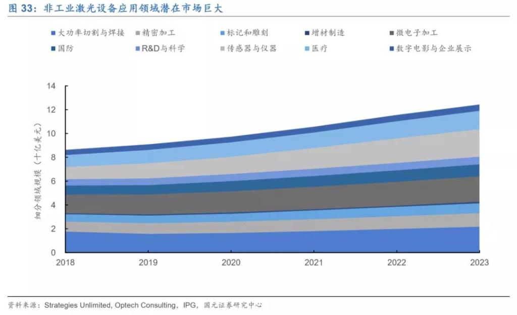 非工業(yè)激光設(shè)備應(yīng)用潛在市場巨大,看好醫(yī)療、傳感器、微電子等領(lǐng)域發(fā)展。據(jù)海外咨詢公司 Optech Consulting 和 Strategies Unlimited 預(yù)計,未來非工業(yè)激光設(shè)備應(yīng)用規(guī)模將有望超過工業(yè)設(shè)備應(yīng)用,占比較大且增長較快的非工業(yè)應(yīng)用領(lǐng)域主要包括醫(yī)療、傳感器與儀器、微電子加工等下游領(lǐng)域。