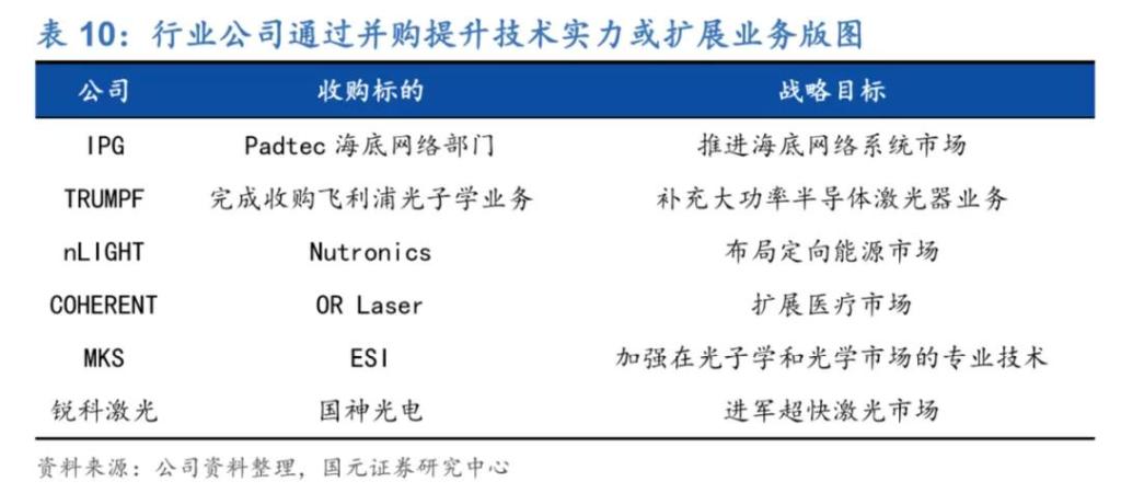 兼并收購為激光器企業(yè)重要擴張手段,以快速提升技術(shù)實力或進入新的市場。2019年全球激光器市場參與者進行多項并購以提升技術(shù)實力或進入細分領(lǐng)域市場,例如 nLIGHT 公司以 3330 萬美元收購為國防市場提供高能激光系統(tǒng)的相干組合激光及光束控制系統(tǒng)領(lǐng)先開發(fā)商Nutronics 以布局定向能源市場,銳科激光以1.15 億元收購超快激光器廠商國神光電以進軍超快激光市場等。