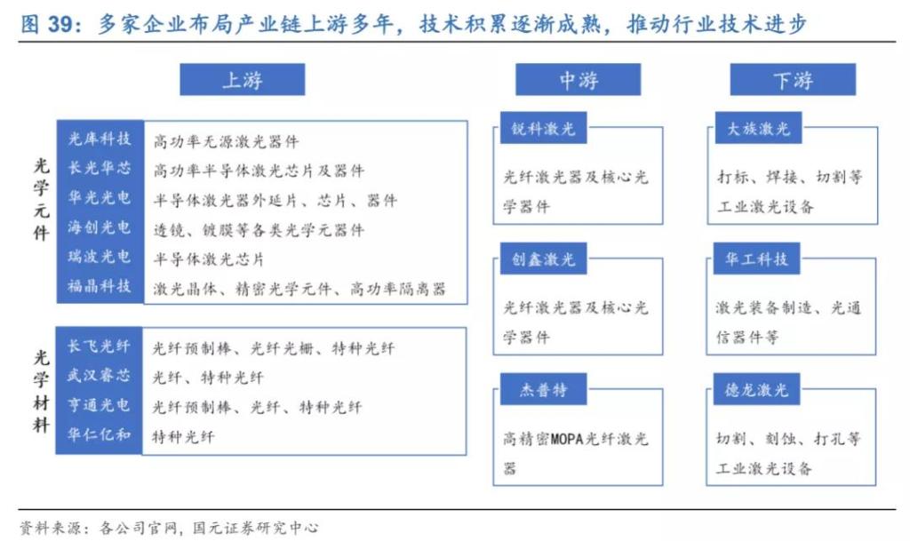 中國激光器產(chǎn)業(yè)蓬勃發(fā)展,上游技術(shù)積累逐漸成熟。光纖激光器具有泵浦源、激光芯片、光纖光柵、準直器等一系列核心部件,原先核心部件依賴進口導(dǎo)致光纖激光器制造成本居高不下限制了國內(nèi)企業(yè)發(fā)展。伴隨中國激光器產(chǎn)業(yè)發(fā)展,以激光芯片及器件、激光晶體等為發(fā)力點,多家企業(yè)布局產(chǎn)業(yè)鏈上游,產(chǎn)品技術(shù)積累逐漸成熟, 有望推動行業(yè)整體技術(shù)進步。