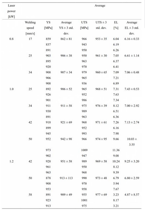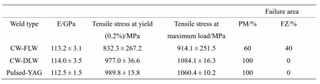 研究表明Nd:YAG激光器加工后的焊接質(zhì)量高于用光纖激光器或二極管激光器產(chǎn)生的焊縫。三種焊接類型的硬度值非常相似。但是強度和塑性不同,這主要是受到不同類型孔的焊接缺陷的影響。三種焊接形式的力學(xué)性能如表4.2所示。