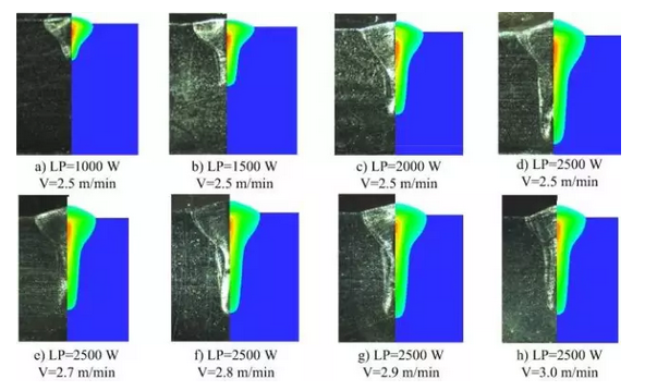 在功率恒定的情況下,焊接速度的增加導(dǎo)致加熱時間過短,不足以產(chǎn)生顯著的熔池深度。在高焊接速度下,模擬結(jié)果與實驗數(shù)據(jù)一致。由于在較低速度下,光束在匙孔內(nèi)多次反射,吸收率增加,模擬略微不同于實驗。熱影響區(qū)隨著焊接速度的增加而減小。