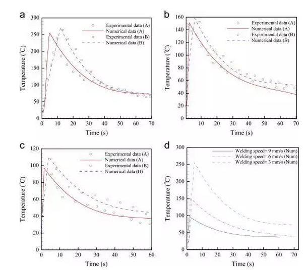 Akbari M[17]等人進行了激光焊接鈦合金(Ti6Al4V)的數(shù)值和實驗研究,模擬了溫度分布,熱影響區(qū)(HAZ),熔池的深度和寬度。研究發(fā)現(xiàn),在恒定的焊接速度下,不同焊接速度的溫度歷史有相似的趨勢。降低焊接速度,溫度圖的峰值增加,并且其最大值出現(xiàn)在較長時間(圖2.3)。