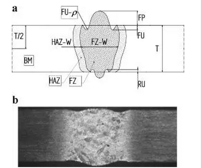 圖2.1 (a)焊縫典型的橫截面示意圖。FU:表面填充,RU:根部填充,F(xiàn)U-ρ:表面填充半徑,F(xiàn)Z-W:熔融區(qū)寬度,HAZ-W:熱影響區(qū)寬度;(b)典型橫截面的宏觀圖(1.2kW,42mm / s的焊縫)