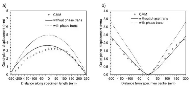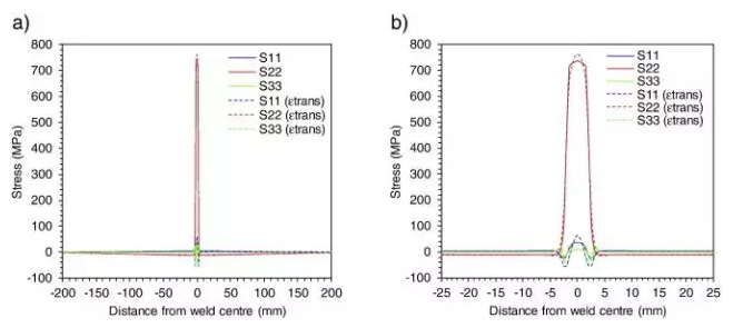 圖5.4 殘余應(yīng)力分布:(a)在所有三個主要方向上,在焊縫附近的整個寬度上,(b)橫向(11),縱向(22)和具有及不具有相變的法線方向