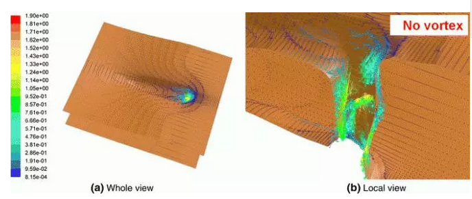 對于較低功率,較低速度的焊接,匙孔后面的流體流動是湍流和不穩(wěn)定的,并且形成渦流。預(yù)測熔融金屬從熔池的中心面流走,并且在熔池中,匙孔的后面留下間隙或空隙。對于較高功率,較高速度的焊接,流體流動并不湍急,不形成這種渦流。模擬預(yù)測的工件表面處的流體流速如圖5.3。