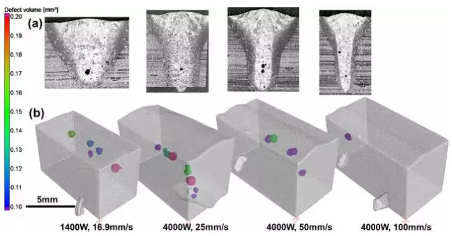 該研究認為,匙孔激光焊接時,氣孔可能是匙孔后面流體湍流的結(jié)果,相關(guān)的雷諾數(shù)越大,氣孔形成的可能性就越高。對于這種流體流動控制的氣孔,降低匙孔附近流體流動的雷諾數(shù),可以有效地減少或避免氣孔。