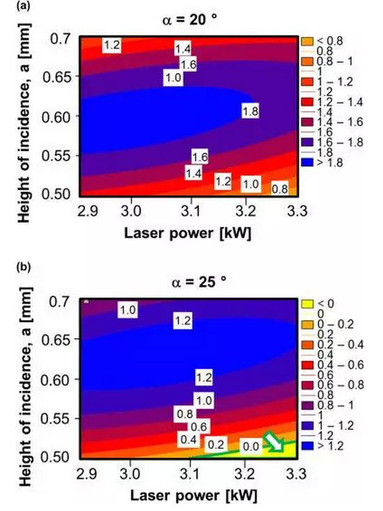 Nikolai Kashaev等人對Ti-6Al-4V對接接頭和T接頭進行Nd:YAG單面激光焊接工藝進行了研究,使用合金兼容的填充焊絲來避免底部填充和咬邊。他們使用二次回歸建立了“非焊接皮”寬度與激光功率、入射角和入射高度的關(guān)系,通過合理的參數(shù)優(yōu)化,獲得了具有低孔隙率和適當(dāng)幾何形狀的焊縫。優(yōu)化結(jié)果如圖2.2所示。