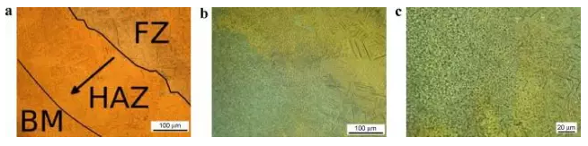 圖3.3 1kW,50mm / s下的HAZ顯微組織。(a) HAZ的放大;箭頭指向從FZ相鄰的富含α'區(qū)域到BM附近的貧α'區(qū)域。(b)HAZ / BM界面(HAZ位于右側(cè))的微觀組織。(c)b的放大。