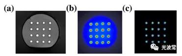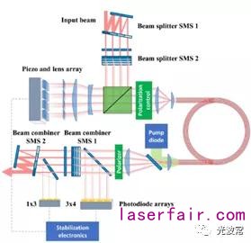 多纖芯光纖合成系統(tǒng)則將光束通過了一個4×4的壓電調(diào)控鏡面矩陣來維持相位穩(wěn)定(圖6),借由鏡面反射過程中發(fā)生的光束水平豎直方向翻轉(zhuǎn)減小了在最后telescope處的球差。鏡面矩陣之前放置了透鏡矩陣,把鏡面安裝時微小的傾斜轉(zhuǎn)化為橫向的光束偏移,從而減小光束矩陣的畸變。之后,利用四分之一波片調(diào)節(jié)光束的偏振。為避免各個通道之間存在熱耦合,該課題組優(yōu)化了纖芯直徑以及各纖芯之間的間距。整個系統(tǒng)為filled-aperture結(jié)構(gòu),有利于提高合束效率。