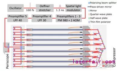 德國Jena課題組是該技術(shù)的開拓者。他們在2017年報道了利用集成化程度比較高的16個分離的光纖放大通道對光束進行放大再合束 [1],實驗裝置如圖1所示。在主放大器之前,通過脈沖展寬器將脈沖展寬并用空間光調(diào)制器調(diào)節(jié)其相位,隨后又經(jīng)過3個PM980光纖、兩個聲光耦合器、2級模場直徑分別為42 μm及56 μm的大軸距光纖進行了預放大,得到了50 w左右的功率。在該工作中,主放大器增益光纖為大模場面積棒狀光纖??臻g合成系統(tǒng)在分束時是用偏振分光器和半波片把光束先分為上下兩束再進一步把上下的光束各分成并列的八束。為了提高合成效率和光束品質(zhì),該系統(tǒng)利用半波片及四分之一波片對非線性偏振旋轉(zhuǎn)進行補償;每個通道均有壓電驅(qū)動的反射鏡,用于穩(wěn)定每路的相位。最終通過集成的布儒斯特型薄膜偏振器完成合束后,再利用Treacy型光柵壓縮器對脈沖進行壓縮。