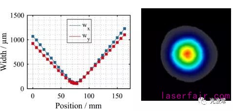 經(jīng)過多纖芯光纖放大后的光束又一次經(jīng)過兩級分段鏡面,從而把16束光合束,其光束質(zhì)量因子小于1.2(圖7左),可以獲得近衍射極限大小的光斑(圖7右)。