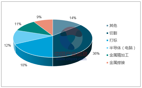 以工作物質(zhì)分類,工業(yè)激光器可以分為光纖激光器、CO2 激光器、固體激光器和其他激光器,其中,光纖激光器在材料加工領(lǐng)域占比最高。2016 年,全球光纖激光器銷售額為 13.05 億美元,占工業(yè)激光器銷售額的 41.34%。光纖激光器市場規(guī)模的快速增長系工業(yè)激光器市場規(guī)模增長的主要原因。在材料加工方面,工業(yè)激光器主要用于切割、打標(biāo)、金屬精加工、金屬焊接等,其中,切割和打標(biāo)為最重要的兩個應(yīng)用領(lǐng)域。2016 年,全球工業(yè)激光器在材料加工方面的應(yīng)用中,切割應(yīng)用占 36%,打標(biāo)應(yīng)用占 18%。具體情況詳見下圖: