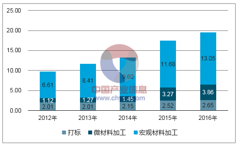 根據(jù)報告, 光纖激光器的用途可以為打標(biāo)、微材料加工(Micro Processing) 、宏觀材料加工(Macro Processing)三大類。其中, 微材料加工包括了除打標(biāo)以外, 所有輸出功率小于 1,000W 的激光器應(yīng)用;宏觀材料加工包括了所有輸出功率大于等于1,000W 的激光器應(yīng)用, 主要為金屬切割和焊接。近年來,光纖激光器市場規(guī)模保持增長,其中,用于宏觀材料加工的激光器市場規(guī)模增長迅速,從 2012 年的 3.49 億美元增加至 2016 年的 6.53億美元,年復(fù)合增長率為 16.96%;用于打標(biāo)的光纖激光器市場規(guī)模從 2012 年2.01 億美元增長至 2016 年的 2.65 億美元,年復(fù)合增長率為 7.16%;用于微材料加工的光纖激光器市場規(guī)模從 2012 年的 1.12 億美元增加至 2016 年的 3.86億美元,年復(fù)合增長率為36.25%。2012-2016 年,光纖激光器用途分類如下圖所示:
