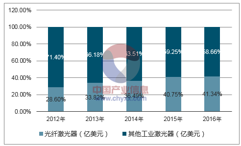 2012-2016 年全球光纖激光器占工業(yè)激光器比重